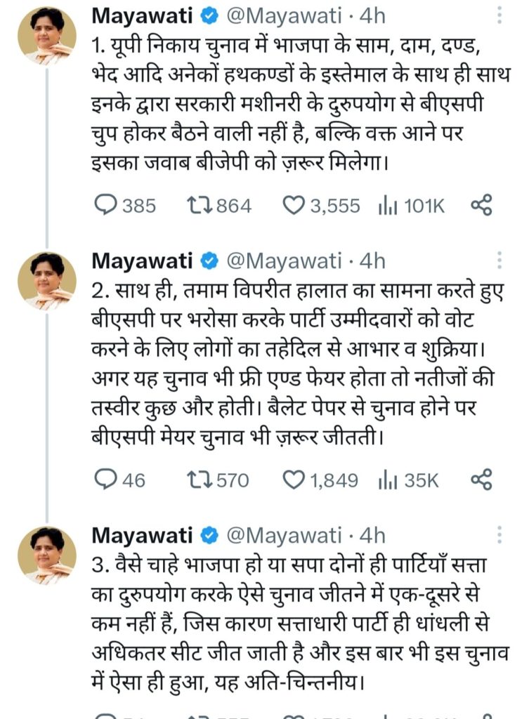 उन्होंने कहा कि बैलेट पेपर से चुनाव होने पर बीएसपी मेयर चुनाव भी जरूर जीतती। बसपा सुप्रीमो ने कहा कि वैसे चाहे भाजपा हो या सपा दोनों ही पार्टियां सत्ता का दुरुपयोग करके ऐसे चुनाव जीतने में एक दूसरे से कम नहीं है जिस कारण सत्ताधारी पार्टी ही धांधली से अधिकतर सीट दी जाती है। इस बार भी इस चुनाव में ऐसा ही हुआ यह अति चिंतनीय है।