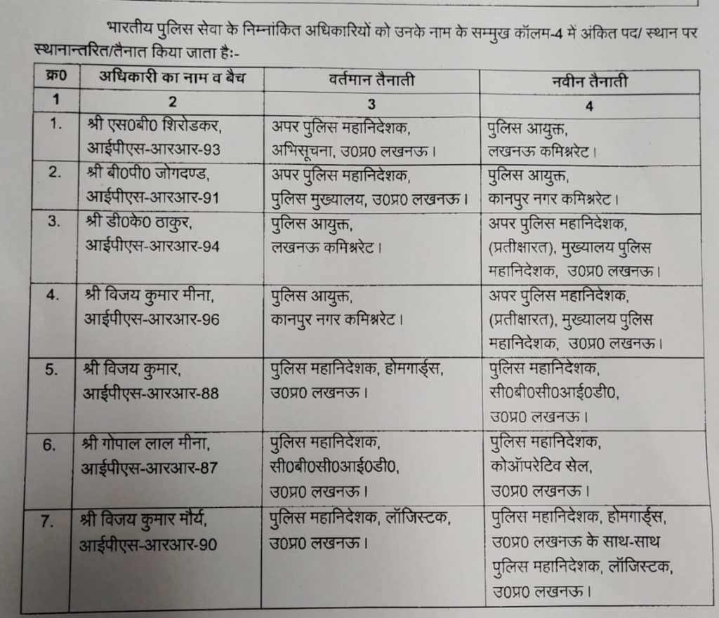 लखनऊ। उत्तर प्रदेश में सोमवार की सुबह सात वरिष्ठ आईपीएस अधिकारियों के तबादले किए गए हैं । आज हुए तबादलों में लखनऊ व कानपुर के पुलिस कमिश्नर भी बदले गए हैं । शासन से जारी हुई लिस्ट के अनुसार आज यूपी में 7 वरिष्ठ आईपीएस अधिकारियों के तबादले किए गए हैं । आज जो अधिकारी बदले गए हैं उनमें एडीजी अभिसूचना के पद पर कार्यरत एसबी शिरोड़कर को लखनऊ का नया पुलिस कमिश्नर बनाया गया है जबकि लखनऊ में पुलिस कमिश्नर के पद पर तैनात डीके ठाकुर को पुलिस मुख्यालय में प्रतीक्षारत किया गया है । इसके अलावा बीपी जोगदंड को कानपुर का नया पुलिस कमिश्नर बनाया क्या है तो वही कानपुर में तैनात पुलिस कमिश्नर विजय कुमार मीणा को पुलिस मुख्यालय में अटैच किया गया है। इसके अलावा डीजी होमगार्ड के पद पर तैनात रहे विजय कुमार को डी जी सीबी सीआईडी बनाया गया है डीजी सीबीसीआईडी के पद पर तैनात रहे गोपाल लाल मीणा को डी जी कोऑपरेटिव सेल बनाया गया है एडीजी लॉजिस्टिक के पद पर तैनात विजय कुमार मौर्य को इस पद के साथ-साथ डीजी होमगार्ड का भी जिम्मेदारी दी गई है। देखिए पूरी लिस्ट —-