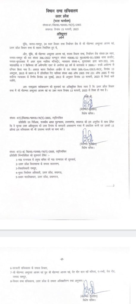उल्लेखनीय है कि यूपी के रामपुर जनपद की स्वार विधानसभा से वर्ष 2022 में हुए विधानसभा चुनाव में सपा के वरिष्ठ नेता आजम खान के बेटे अब्दुल्ला आजम खान को विधायक चुना गया था।