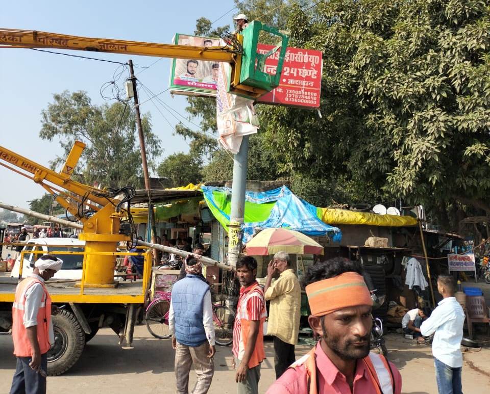 Jalaun news today । जालौन नगर में अवैध होर्डिंग से नगर पालिका को एक धेले की कमाई नहीं है। इसके बावजूद नगर में जगह जगह अवैध होर्डिंग की बाढ़ आई हुई थी। अवैध होर्डिंग को लेकर अब प्रशासन ने सख्ती अपना ली है। सोमवार को नगर पालिका ने अभियान चलाकर मुख्य मार्ग से अवैध होर्डिंग को हटाया।