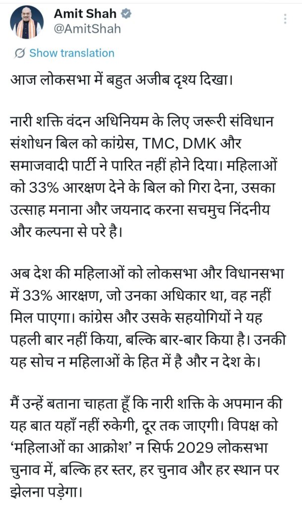 नारी शक्ति वंदन अधिनियम के लिए जरूरी संविधान संशोधन बिल को कांग्रेस, TMC, DMK और समाजवादी पार्टी ने पारित नहीं होने दिया। महिलाओं को 33% आरक्षण देने के बिल को गिरा देना, उसका उत्साह मनाना और जयनाद करना सचमुच निंदनीय और कल्पना से परे है।