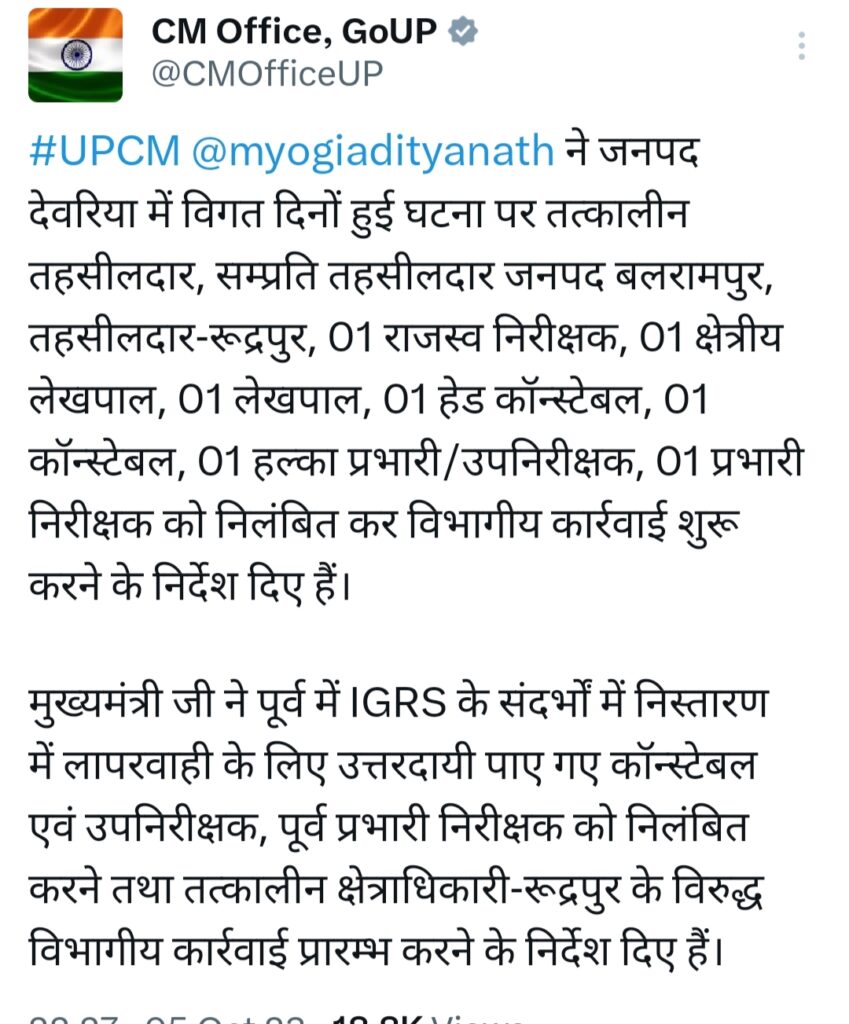 मुख्यमंत्री कार्यालय के ट्विटर हैंडल से मिली जानकारी के अनुसार देवरिया में बिगत दिनों हुई घटना पर मुख्यमंत्री योगी आदित्यनाथ ने तत्कालीन तहसीलदार सम्प्रति तहसीलदार जनपद बलरामपुर तहसीलदार रुद्रपुर राजस्व निरीक्षक क्षेत्रीय लेखपाल प्रभारी निरीक्षक समेत हेड कांस्टेबल को सस्पेंड किया है इसके अलावा इन सभी की विभागीय जांच भी शुरू कर दी गई है।