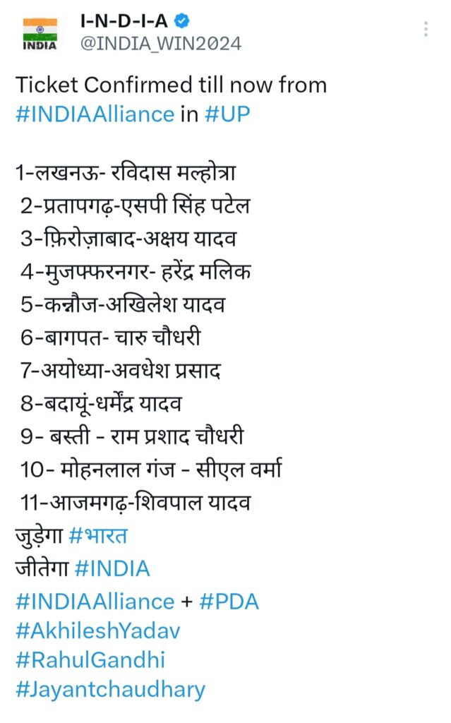 उल्लेखनीय है कि वर्ष 2024 में होने वाले लोकसभा चुनाव में एक बार फिर से फतह हासिल करने के लिए भारतीय जनता पार्टी जहां पुरी की जान से जुटी हुई है तो वही इंडिया गठबंधन भी परिणाम अपने पक्ष में करने के लिए लगा हुआ है । इसी कड़ी में आज इंडिया गठबंधन ने उत्तर प्रदेश में लोकसभा चुनाव के लिए 11 प्रत्याशियों के नाम का ऐलान कर दिया है ।