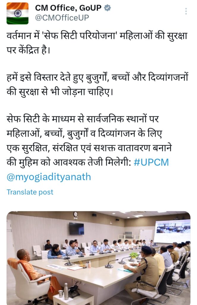 समीक्षा बैठक में मुख्यमंत्री श्री योगी ने कहा कि वर्तमान में सेफ सिटी परियोजना महिलाओं की सुरक्षा पर केंद्रित है हमें इसे विस्तार देते हुए बुजुर्गों बच्चों और दिव्यांगजनों की सुरक्षा से भी जोड़ना चाहिए सेफ सिटी के माध्यम से सार्वजनिक स्थानों पर महिलाओं बच्चों बुजुर्गों व दिव्यांग जनों के लिए एक सुरक्षित संरक्षित एवं सशक्त वातावरण बनाने की मुहिम को आवश्यक तेजी मिलेगी।