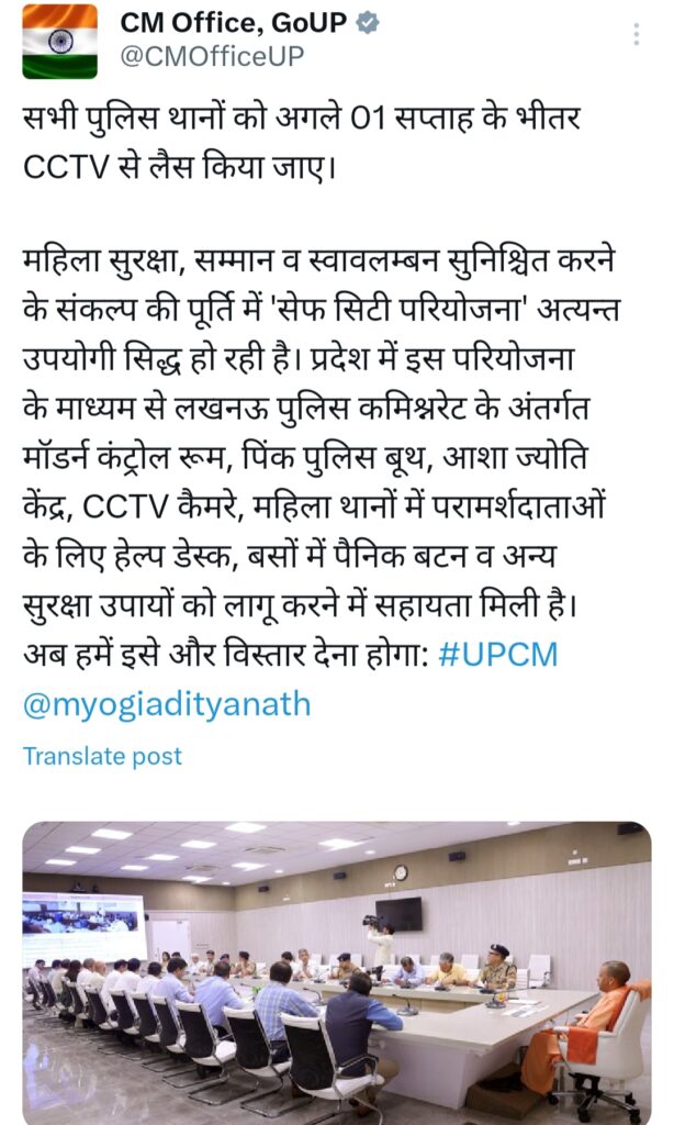 आज हुई सेफ सिटी परियोजना की समीक्षा बैठक के अवसर पर मुख्यमंत्री श्री योगी ने बैठक में मौजूद अधिकारियों को निर्देश जारी करते हुए कहा कि प्रदेश के सभी पुलिस थानों को एक सप्ताह के अंदर सीसीटीवी से लैस किया जाए । उन्होंने कहा कि महिला सुरक्षा सम्मान व स्वावलंबन सुनिश्चित करने के संकल्प की पूर्ति में सेफ सिटी परियोजना अत्यंत उपयोगी सिद्ध हो रही है प्रदेश में इस परियोजना के माध्यम से लखनऊ पुलिस कमिश्नरेट के अंतर्गत मॉडल कंट्रोल रूम पिंक पुलिस बूथ आशा ज्योति केंद्र सीसीटीवी कैमरे महिला थानों में परामर्शदाताओं के लिए हेल्प डेस्क बसों में पैनिक बटन व अन्य सुरक्षा उपायों को लागू करने में सहायता मिली है अब हमें इसे और विस्तार देना होगा।