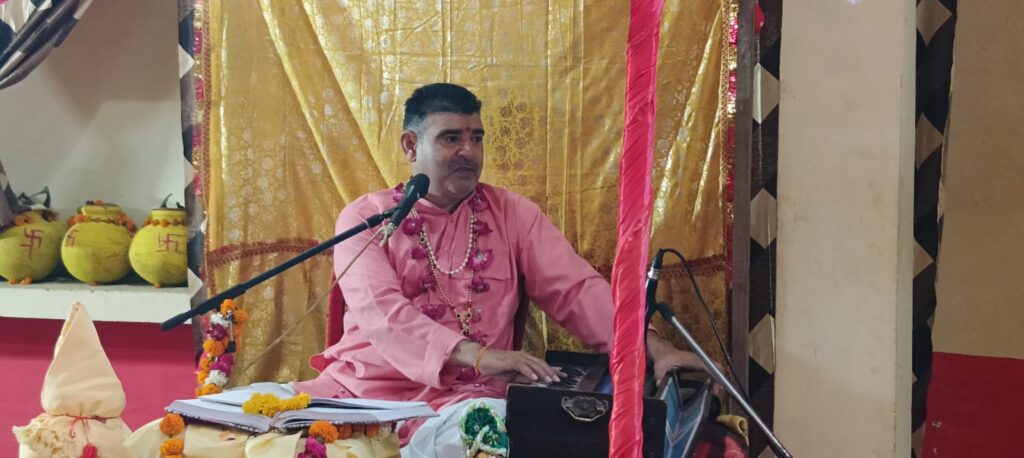 Jalaun news today ।जालौन नगर के नाना महाराज मंदिर पर आयोजित साप्ताहिक श्रीमद्भागवत कथा के दूसरे दिन कथा व्यास पंडित प्रदीप तिवारी ने श्रीमद्भागवत कथा के महात्म्य और राजा परीक्षित के जन्म प्रसंग का वर्णन किया।