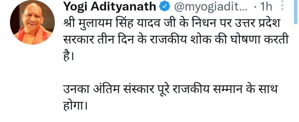 सपा संरक्षक मुलायम सिंह यादव के निधन पर यूपी में तीन दिन का राजकीय शोक घोषित किया गया है। मुख्यमंत्री योगी आदित्यनाथ ने इसकी घोषणा करते हुए कहा कि श्री मुलायम सिंह यादव जी के निधन पर उत्तर प्रदेश सरकार 3 दिन के राजकीय शोक की घोषणा करती है। उनका अंतिम संस्कार पूरे राजकीय सम्मान के साथ होगा।