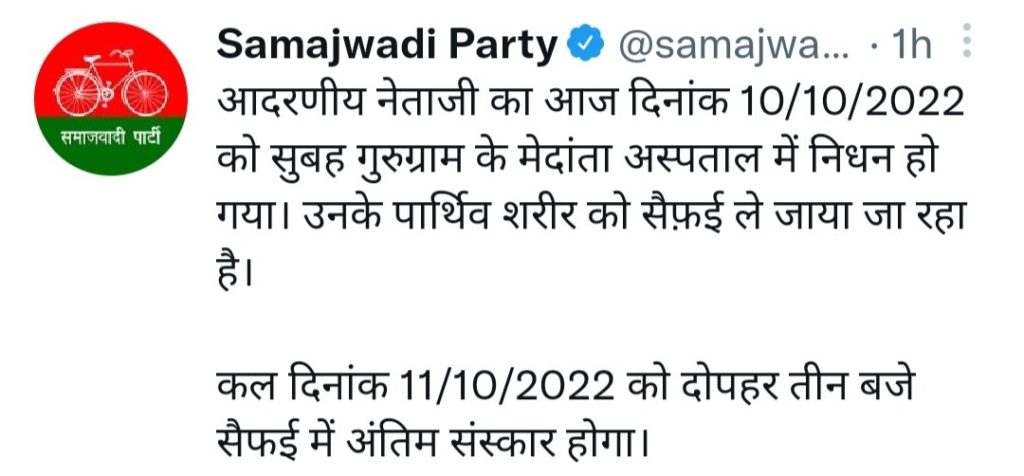 देश की राजनीति के लिए आज एक बहुत ही दुखद खबर है दरअसल आज सुबह सपा संरक्षक मुलायम सिंह यादव का उपचार के दौरान गुरुग्राम के मेदांता अस्पताल में निधन हो गया । उनके निधन की सूचना उनके बेटे समाजवादी पार्टी के राष्ट्रीय अध्यक्ष अखिलेश यादव ने ट्वीट करके दी । जैसे ही धरती पुत्र मुलायम सिंह यादव के निधन की लोगों को जानकारी हुई तो शोक की लहर दौड़ गई हर कोई नेताजी के निधन की सूचना से स्तब्ध है।