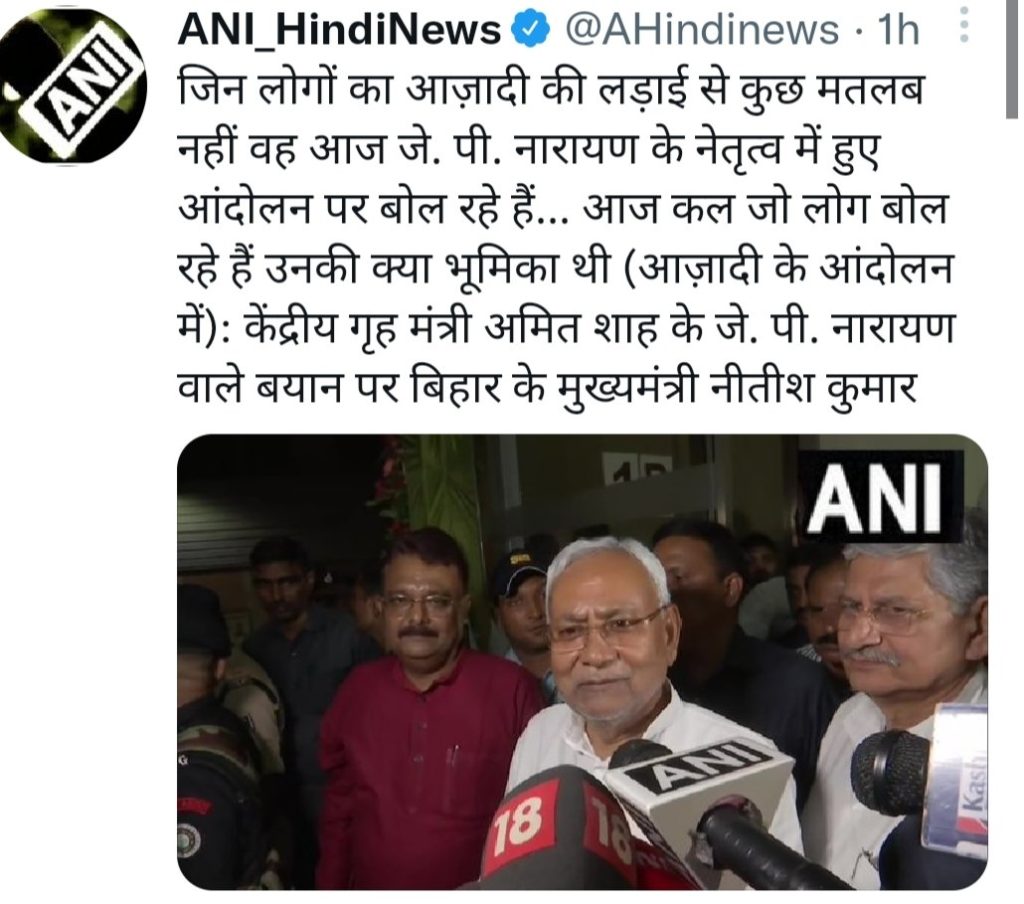 गृहमंत्री अमित शाह पर पलटवार करते हुए बिहार के मुख्यमंत्री नीतीश कुमार ने कहा कि जिन लोगों का आजादी की लड़ाई से कुछ मतलब नहीं वह आज जे पी नारायण के नेतृत्व में हुए आंदोलन पर बोल रहे हैं। उन्होंने कहा कि आजकल जो लोग बोल रहे हैं उनकी क्या भूमिका थी।