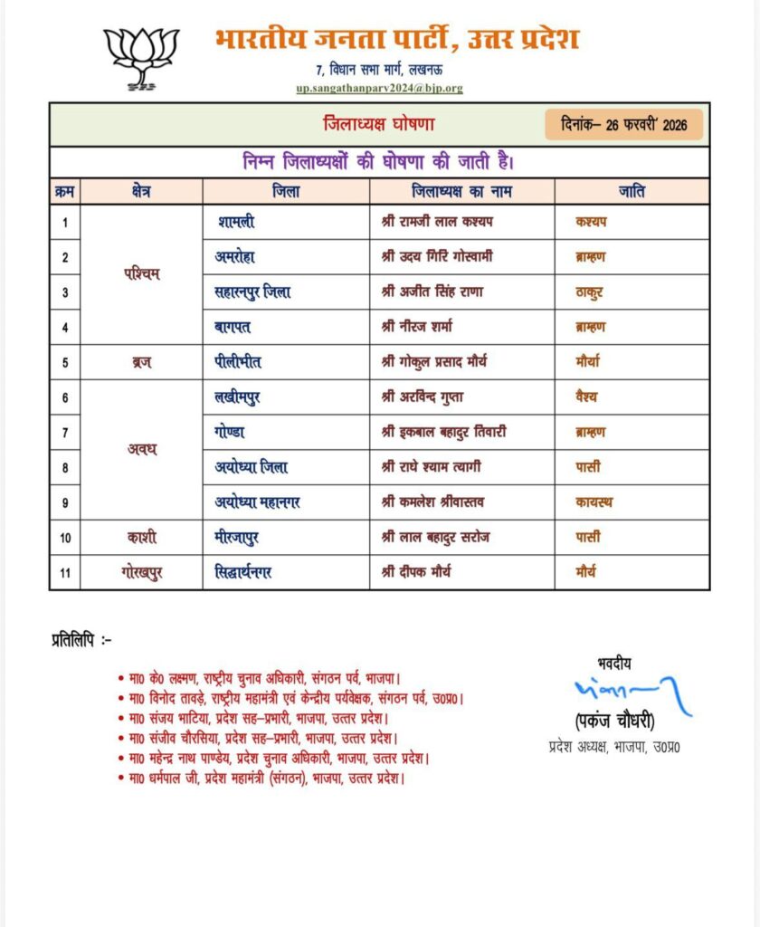 UP news today। भारतीय जनता पार्टी के प्रदेश अध्यक्ष पंकज चौधरी ने गुरुवार को 11 जनपदों के जिला अध्यक्षों के नाम की घोषणा की है।