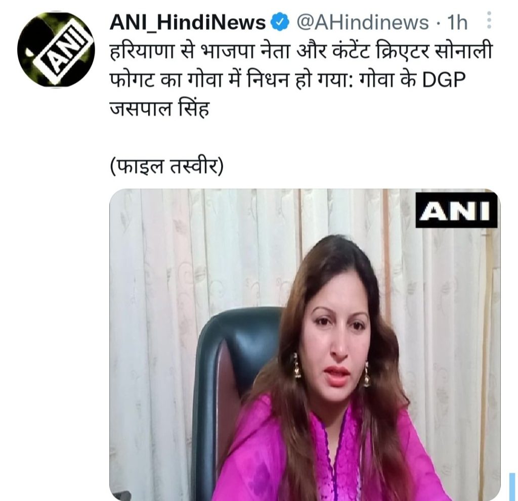भाजपा नेता सोनाली फोगाट का हार्ट अटैक से निधन,,,
