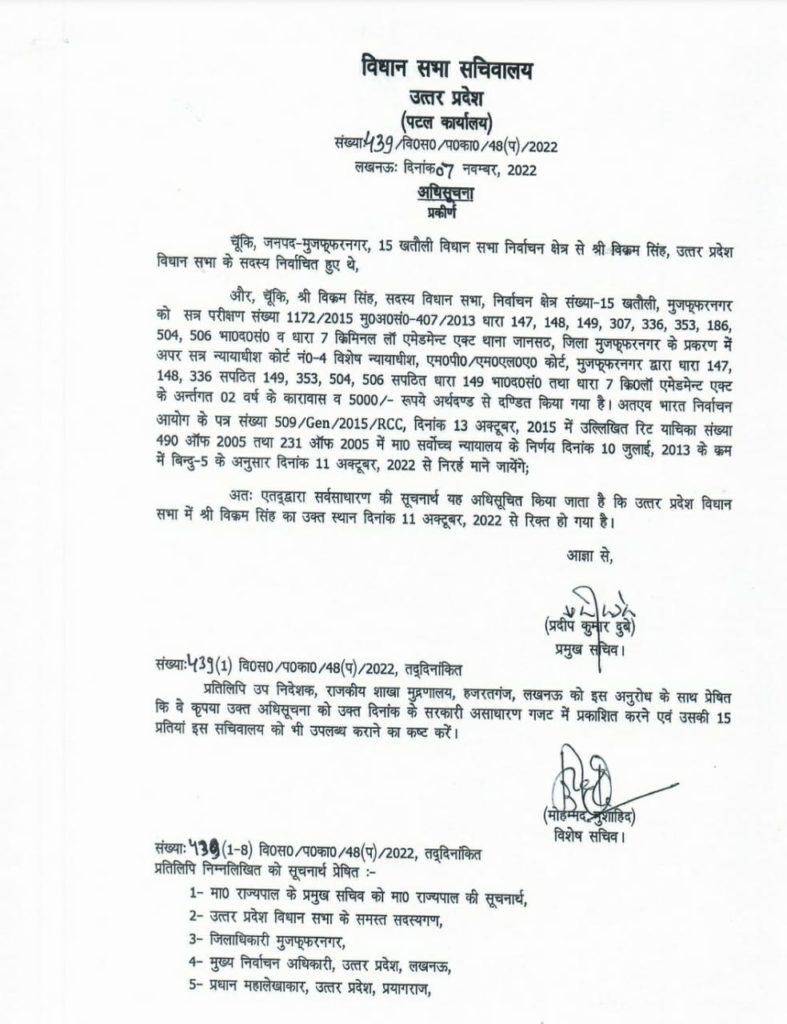 उल्लेखनीय है कि मुजफ्फरनगर के खतौली विधानसभा से दूसरी बार निर्वाचित हुए विक्रम सैनी पर आरोप है कि इसी जिले में हुए वबाल में उनका भी हाथ था। इसी मामले को लेकर एमपी एमएलए कोर्ट ने भाजपा विधायक को दो साल की सजा सुनाई गई थी। इसी मामले को लेकर आज यूपी के प्रमुख सचिव विधानसभा प्रदीप कुमार दुबे ने आज आदेश जारी करते हुए भाजपा विधायक की सदस्यता रद्द करने का आदेश जारी कर दिया है। जारी किए गए आदेश के अनुसार विक्रम सैनी की सदस्यता 11 अक्टूबर से रद्द मानी जायेगी।