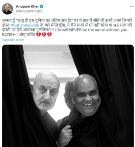 बॉलीवुड के अभिनेता अनुपम खेर ने एक्टर डायरेक्टर सतीश कौशिक के निधन पर लिखा कि जानता हूं मृत्यु ही इस दुनिया का अंतिम सच है पर यह बात में जीते जी कभी अपने जिगरी दोस्त सतीश कौशिक के बारे में लिखूंगा यह मैंने सपने में भी नहीं सोचा था 45 साल की दोस्ती पर ऐसे अचानक पूर्णविराम