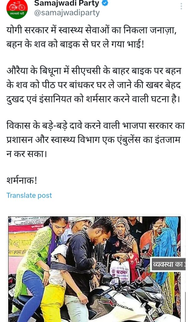 औरैया के विधूना में हुई इस घटना को लेकर समाजवादी पार्टी ने भाजपा सरकार पर करारा प्रहार करते हुए उसे घेरा है। समाजवादी पार्टी ट्विटर हैंडल से जारी किए गए ट्वीट में कहा गया कि योगी सरकार में स्वास्थ्य सेवाओं का निकला जनाजा बहन के शव को बाइक से घर ले गया भाई आगे कहा गया कि औरैया के बिधूना में chc के बाहर बाइक पर बहन के शव को पीठ पर बांधकर घर ले जाने की खबर बेहद दुखद एवं इंसानियत को शर्मसार करने वाली घटना है। विकास के बड़े-बड़े दावे करने वाली भाजपा सरकार का प्रशासन और स्वास्थ्य विभाग एक एंबुलेंस का इंतजाम न कर सका। शर्मनाक