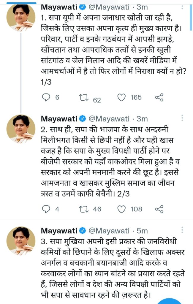 बसपा सुप्रीमो ने कहा कि सपा यूपी में अपना जनाधार खोती जा रही है जिसके लिए उसका अपना कृत्य मुख्य कारण है परिवार पार्टी व 8नके संगठन में आपसी झगड़े खींचतान तथा आपराधिक तत्वों से इनके खुली सांठगांठ व जेल मिलान आदि की खबरें मीडिया में आम चर्चाओं में है तो फिर लोगों में निराशा क्यों ना हो? बसपा सुप्रीमो ने कहा कि साथ ही सपा की भाजपा के साथ अंदरूनी मिलीभगत किसी से छिपी नहीं है और यही खास वजह है कि सपा के मुख्य विपक्षी पार्टी होने पर बीजेपी सरकार को यहां वॉकओवर मिला हुआ है। सरकार को अपनी मनमानी करने की छूट है इससे आम जनता व खासकर मुस्लिम समाज का जीवन त्रस्त हुआ उनमें काफी बेचैनी है उन्होंने कहा कि सपा मुखिया अपनी इसी प्रकार की जनविरोधी कमियों को छिपाने के लिए दूसरों के खिलाफ अक्सर अनर्गल व बचकानी बयानबाजी आदि करके व करवा कर लोगों का ध्यान बांटने का प्रयास करते रहते हैं जिससे लोगों व बांटन देश की अन्य विपक्षी पार्टियां को भी सपा से सावधान रहने की जरूरत है।