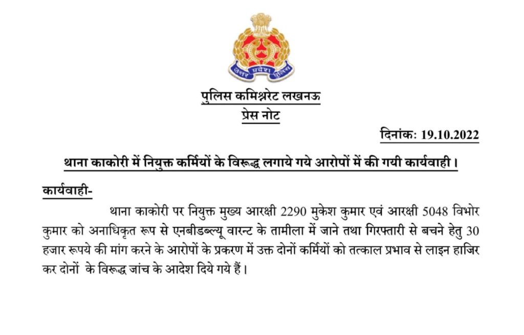 लखनऊ । उत्तर प्रदेश की राजधानी लखनऊ के कस्बा काकोरी में एनबीडब्लू वारंट के आरोपियों को गिरफ्तारी से बचाने के मामले में तीस हजार रुपए वसूलने के आरोप में एक दीवान व सिपाही को पुलिस कमिश्नर द्वारा लाइन हाजिर कर दिया गया है । रिपोर्ट के अनुसार आरोप के प्रकरण की जांच पड़ताल का आदेश जारी हुआ।