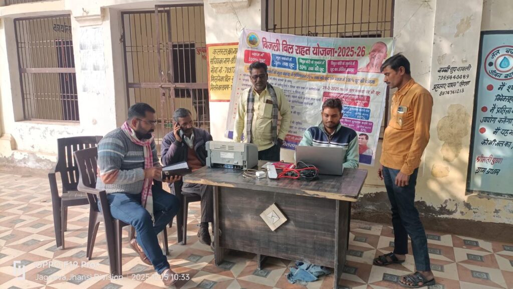 Jalaun news today । प्रदेश सरकार द्वारा शुरू की गई बिजली बिल राहत योजना 2025 को जन-जन तक पहुंचाने के लिए ग्राम भदवां में शिविर लगाया गया। जिसमें विभागीय टीम ने ग्रामीणों को योजना के लाभों के बारे में जानकारी दी गई। साथ ही बकाएदारों से लगभग डेढ़ लाख रुपये भी वसूले गए।