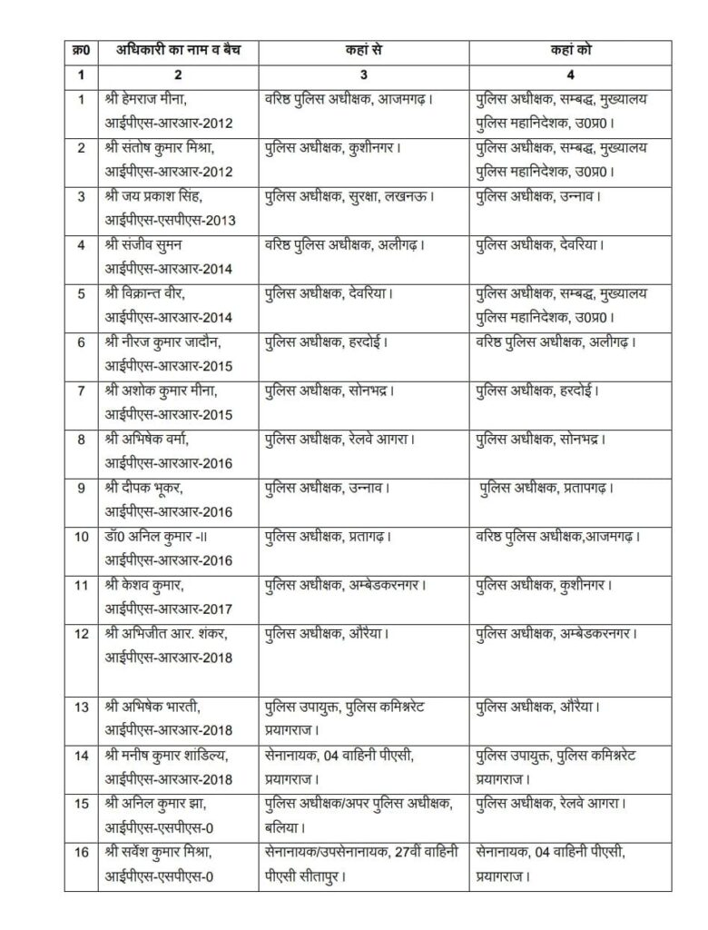 आजमगढ़ के वरिष्ठ पुलिस अधीक्षक रहे हैं हेमराज मीणा को डीजीपी ऑफिस से अटैच करते हुए प्रतापगढ़ जनपद के पुलिस अधीक्षक अनिल कुमार सेकंड को आजमगढ़ का नया पुलिस कप्तान बनाया गया है संतोष कुमार मिश्रा को कुशीनगर से हटा कर डीजीपी ऑफिस में अटैच किया गया है जयप्रकाश सिंह को उन्नाव का नया पुलिस अधीक्षक बनाया गया है संजीव सुमन देवरिया के नए पुलिस अधीक्षक बनाए गए हैं विक्रांत वीर को देवरिया से हटाकर डीजीपी ऑफिस में अटैच किया गया है नीरज कुमार जादौन को हरदोई से अलीगढ़ का नया पुलिस अधीक्षक बनाकर भेजा गया है अशोक कुमार मीणा को सोनभद्र से हरदोई का नया पुलिस अधीक्षक बनाया गया है अभिषेक वर्मा को सोनभद्र का नया पुलिस अधीक्षक बनाया गया है दीपक भूकर को प्रतापगढ़ का पुलिस कप्तान बनाया गया है केशव कुमार को कुशीनगर जनपद की कमान दी गई है औरैया के पुलिस अधीक्षक रहे अभिजीत आर शंकर अंबेडकर नगर के नए पुलिस अधीक्षक बनाए गए हैं जबकि प्रयागराज पुलिस कमिश्नरेट में तैनात अभिषेक भारती को औरैया का नया पुलिस अधीक्षक बनाया गया है।