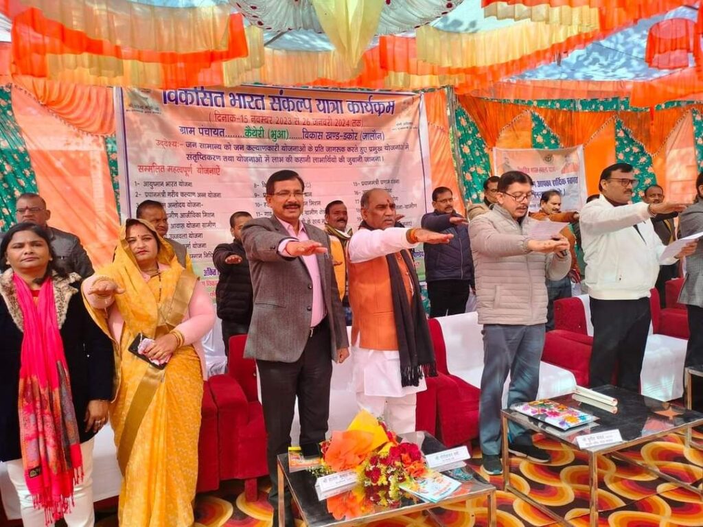 Orai / jalaun news today । संयुक्त सचिव भारत सरकार पुनीत यादव, सदर विधायक गौरीशंकर वर्मा एवं जिलाधिकारी राजेश कुमार पाण्डेय की अध्यक्षता में विकास खण्ड डकोर के ग्राम भुआ में भव्य विकसित भारत संकल्प यात्रा कार्यक्रम का आयोजन किया गया। संयुक्त सचिव भारत सरकार ने जनप्रतिनिधियों व आमजन मानस को विकसित भारत संकल्प की शपथ दिलाई। इस अवसर पर एलइडी वैन के माध्यम से सरकार की योजनाओं पर आधारित लघु फिल्म का प्रदर्शन भी किया गया। उन्होंने कहा कि केंद्र सरकार की जन कल्याणकारी योजनाओं से पात्र लाभार्थी सीधे लाभांवित हो रहे हैं। सरकार आमजन के जीवन स्तर को बेहतर करने के लिए प्रतिबद्ध है जिसका परिणाम निरंतर देखने को मिल रहा है। उन्होंने कहा कि विकसित भारत संकल्प यात्रा का उद्देश्य शासकीय योजनाओं को घर-घर तक पहुंचना है। उन्होंने कहा कि विकसित भारत के संकल्प हेतु ली गई शपथ को अपने जीवन में उतारें। उन्होंने विकसित भारत की संकल्पना को स्पष्ट करते हुए कहा कि हम विकासशील देशों से आगे बढ़कर विकसित देश की ओर बढ़ रहे हैं तथा जल, थल और नभ के साथ ही विश्व में नई पहचान स्थापित कर रहे हैं।