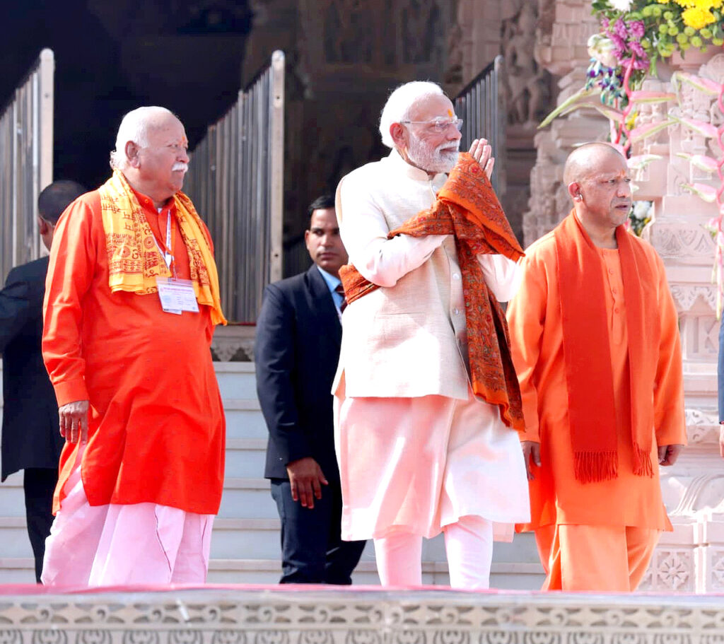 मुख्यमंत्री-गोरक्षपीठाधीश्वर महंत योगी आदित्यनाथ ने श्रीराम जन्मभूमि मंदिर के शिखर पर भगवा ध्वज के आरोहण समारोह में प्रधानमंत्री नरेंद्र मोदी व राष्ट्रीय स्वयंसेवक संघ के सरसंघ चालक मोहन भागवत की उपस्थिति में अपने विचार रखे। सीएम योगी समेत सभी विशिष्टजनों ने झुककर भगवा ध्वज को प्रणाम निवेदित किया। मुख्यमंत्री योगी आदित्यनाथ ने प्रधानमंत्री नरेंद्र मोदी व राष्ट्रीय स्वयं सेवक संघ के सरसंघ चालक मोहन भागवत को स्मृति चिह्न भी प्रदान किया।