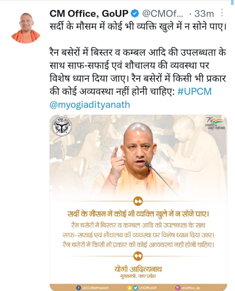 उत्तर प्रदेश के लोगों को भीषण सर्दी से बचाने के लिए मुख्यमंत्री योगी आदित्यनाथ हर संभव प्रयास कर रहे हैं । वह लगातार प्रदेश में तैनात अधिकारियों को सर्दियों में कोई खुले में कोई ना सोए इसके संबंध में निर्देश जारी कर रहे हैं। इसी कड़ी में मुख्यमंत्री श्री योगी ने बुधवार को एक बार फिर से सूबे में तैनात अधिकारियों को निर्देश जारी किए हैं । श्री योगी ने जारी किए गए निर्देश में कहा कि सर्दी के मौसम में कोई भी व्यक्ति खुले में ना सोने पाए।