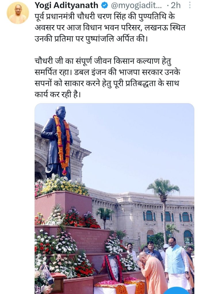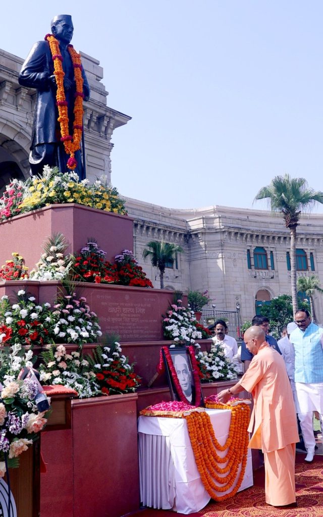 Lucknow news today । उत्तर प्रदेश के मुख्यमंत्री योगी आदित्यनाथ ने पूर्व प्रधानमंत्री चौधरी चरण सिंह की पुण्यतिथि पर उनकी प्रतिमा पर माल्यार्पण कर श्रद्धासुमन अर्पित किए। इस अवसर पर सीएम योगी ने कहा कि देश के महान नेता, पूर्व प्रधानमंत्री व उत्तर प्रदेश के पूर्व मुख्यमंत्री चौधरी चरण सिंह जी का पूरा जीवन भारत के मूल्यों व आदर्शों की स्थापना के साथ ही जमीनी धरातल से जुड़े किसानों और श्रमिकों के कल्याण के लिए समर्पित था। चौधरी साहब का स्पष्ट कहना था कि देश के विकास का रास्ता गांव की पगडंडी से होकर जाता है। अन्नदाता किसान गांव का विकास व समृद्धि का आधार है। किसान सर्वोच्च प्राथमिकता का विषय होना चाहिए।