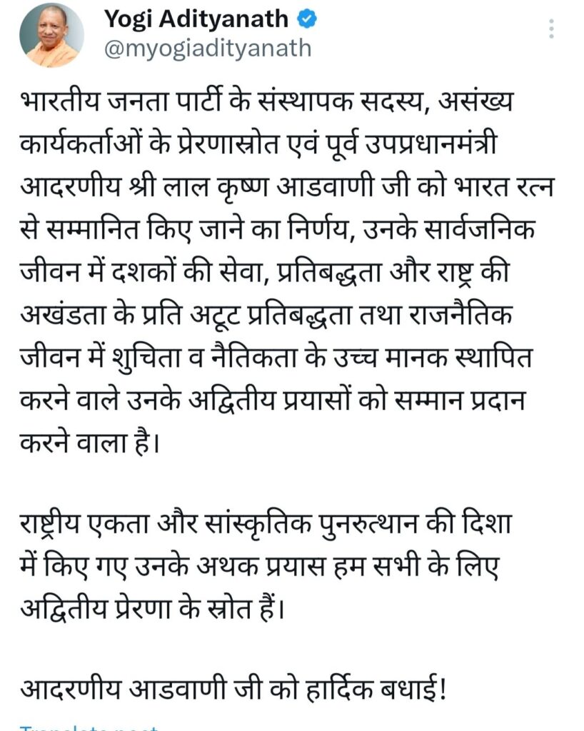 UP news today । भारत सरकार ने शनिवार को एक महत्वपूर्ण निर्णय लेते हुए भाजपा के संस्थापक सदस्य और पूर्व उप प्रधानमंत्री लालकृष्ण आडवाणी को भारत रत्न सम्मान देने की घोषणा की है। इस निर्णय पर उत्तर प्रदेश के मुख्यमंत्री योगी आदित्यनाथ ने हर्ष जताया है और इसको उनके अद्वितीय प्रयासों को सम्मान प्रदान करने वाला करार दिया है। सीएम योगी ने सोशल मीडिया प्लेटफॉर्म एक्स के माध्यम से लाल कृष्ण आडवाणी को बधाई दी और कहा कि राष्ट्रीय एकता और सांस्कृतिक पुनरुत्थान के लिए लाल कृष्ण आडवाणी द्वारा किए गए प्रयास सभी के लिए प्रेरणा का स्रोत हैं। उन्होंने लाल कृष्ण आडवाणी को देश का सर्वोच्च पुरस्कार प्रदान किए जाने के निर्णय की प्रशंसा करते हुए कहा कि वह न सिर्फ भाजपा के संस्थापक सदस्य हैं, बल्कि देश और दुनिया में भाजपा के असंख्य कार्यकर्ताओं के प्रेरणास्रोत भी हैं। उन्होंने कहा कि उनके सार्वजनिक जीवन में दशकों की सेवा, प्रतिबद्धता और राष्ट्र की अखंडता के प्रति अटूट प्रतिबद्धता झलकती है। साथ ही उन्होंने कहा कि आडवाणी जी ने अपने राजनैतिक जीवन में शुचिता व नैतिकता के उच्च मानक स्थापित किए हैं। यह पुरस्कार उनके अद्वितीय प्रयासों को सम्मानित करने वाला है। उल्लेखनीय है कि लाल कृष्ण आडवाणी को भारत रत्न दिए जाने के निर्णय की जानकारी स्वयं प्रधानमंत्री नरेंद्र मोदी ने सोशल मीडिया पोस्ट के माध्यम से दी। लाल कृष्ण आडवाणी भाजपा के सबसे पुराने और बड़े नेताओं में शामिल हैं।