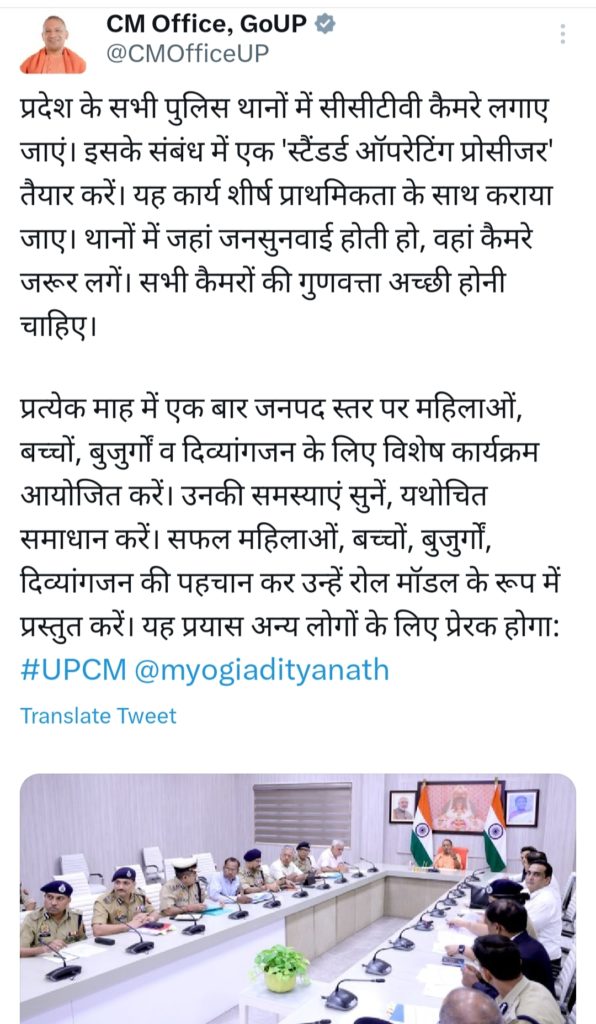 मुख्यमंत्री कार्यालय के ट्विटर हैंडल से मिली जानकारी के अनुसार मुख्यमंत्री योगी आदित्यनाथ ने मंगलवार को प्रदेश के सभी पुलिस थानों में सीसीटीवी कैमरे लगाए जाने के निर्देश जारी किए हैं । इसके संबंध में सीएम योगी ने एक स्टैंडर्ड ऑपरेटिंग प्रोसीजर तैयार करने का भी निर्देश दिए है। मुख्यमंत्री ने जारी किए अपने आदेश में कहा कि यह कार्य से शीर्ष प्राथमिकता के साथ कराया जाए । थानों में जहां जन सुनवाई होती हो वहां कैमरे जरूर लगे और सभी कमरों की गुणवत्ता अच्छी होनी चाहिए। जारी किए गए निर्देश सीएम योगी ने कहा कि प्रत्येक माह में एक बार जनपद स्तर पर महिलाओं बच्चों बुजुर्गों दिव्यांग जनों के लिए विशेष कार्यक्रम आयोजित करें। उनकी समस्याएं सुनें, यथोचित समाधान करें। सफल महिलाओं बच्चों बुजुर्गों की पहचान कर उन्हें रोल मॉडल के रूप में प्रस्तुत करें। यह प्रयास अन्य लोगों के लिए प्रेरक होगा।