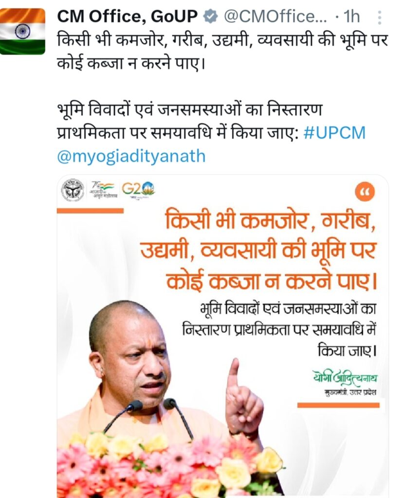 UP news today ।उत्तर प्रदेश के मुख्यमंत्री योगी आदित्यनाथ ने गुरुवार को प्रदेश के जिलों में तैनात आला अधिकारियों को सख्त निर्देश जारी करते हुए कहा की किसी भी कमजोर गरीब व उद्यमी व्यवसाई की भूमि पर कोई कब्जा न करने पाए। सीएम योगी ने जारी किए गए निर्देशों में स्पष्ट कहा है कि जिस जनपदों की ऐसी शिकायत सुनाई दी तो वहां पर तैनात अधिकारियों के खिलाफ सख्त कार्रवाई की जाएगी।