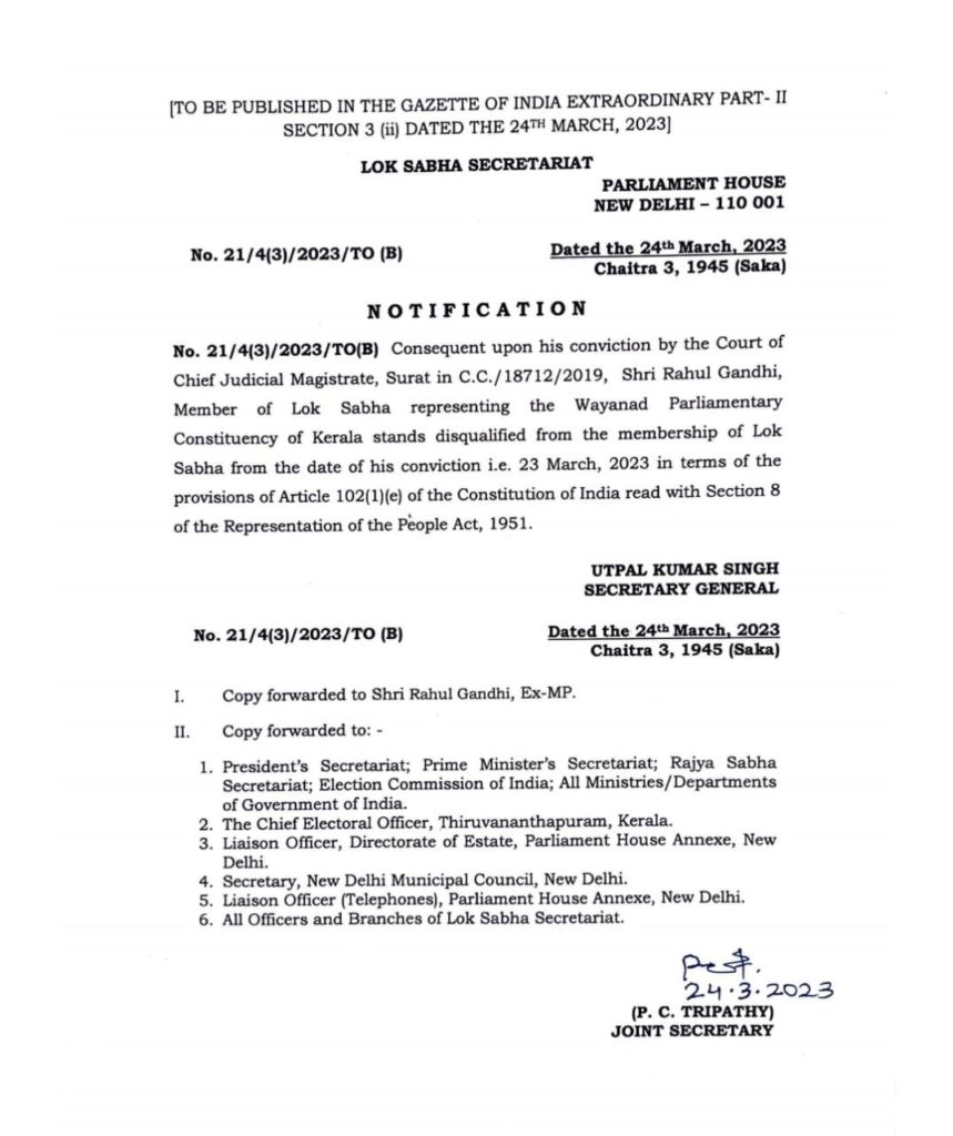 उल्लेखनीय है कि बीते कल गुजरात की सूरत सेशन कोर्ट ने कांग्रेस के वरिष्ठ नेता राहुल गांधी को कर्नाटक में दिए गए एक बयान के मामले में दो वर्ष की सजा सुनाई थी हालांकि कोर्ट ने उन्हें वही से जमानत भी दे दी थी। सेशन कोर्ट से सजा का एलान होने के बाद आज राहुल गांधी की लोकसभा से सदस्यता रद्द कर दी गयी है। इस सम्बंध में जॉइंट सेक्रेटरी ने आदेश भी जारी कर दिया है।