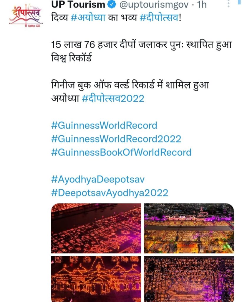 विभाग के अनुसार अयोध्या दीपोत्सव 2022 गिनीज बुक ऑफ वर्ल्ड रिकॉर्ड में शामिल हो गया है।