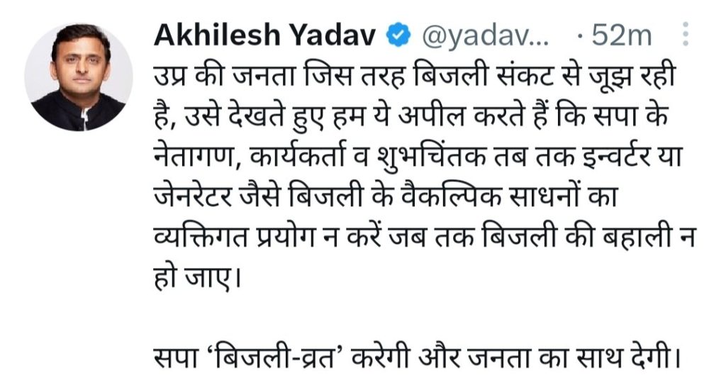 समाजवादी पार्टी के राष्ट्रीय अध्यक्ष श्री यादव ने अपनी पार्टी के नेताओं से ट्वीट करते हुए अपील की कि उत्तर प्रदेश की जनता जिस तरह बिजली संकट से जूझ रही है उसे देखते हुए वह यह अपील करते हैं कि सपा के नेतागण कार्यकर्ता व शुभचिंतक तब तक इनवर्टर या जरनेटर जैसे बिजली के वैकल्पिक साधनों का व्यक्तिगत प्रयोग ना करें जब तक कि बिजली बहाली ना हो जाए। सपा बिजली व्रत करेगी और जनता का साथ देगी