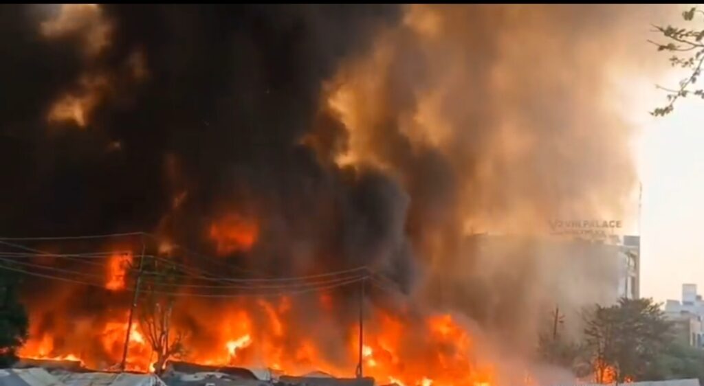 Lucknow news today । उत्तर प्रदेश की राजधानी लखनऊ के विकास नगर थाना क्षेत्र में बुधवार की शाम उस समय हड़कंप मच गया जब टेढ़ी पुलिया चौराहे के पास बसी झुग्गियों में भीषण आग लग गई। प्रत्यक्षदर्शियों का कहना है कि आग इतनी भीषण है कि इसका धुआं लगभग 6 किलोमीटर दूर तक दिख रहा है। सूचना पाकर मौके पर पहुंची दमकल की कई गाड़ियां कड़ी मशक्कत के बाद आग पर काबू पाने के लिए जुटी हुई है।