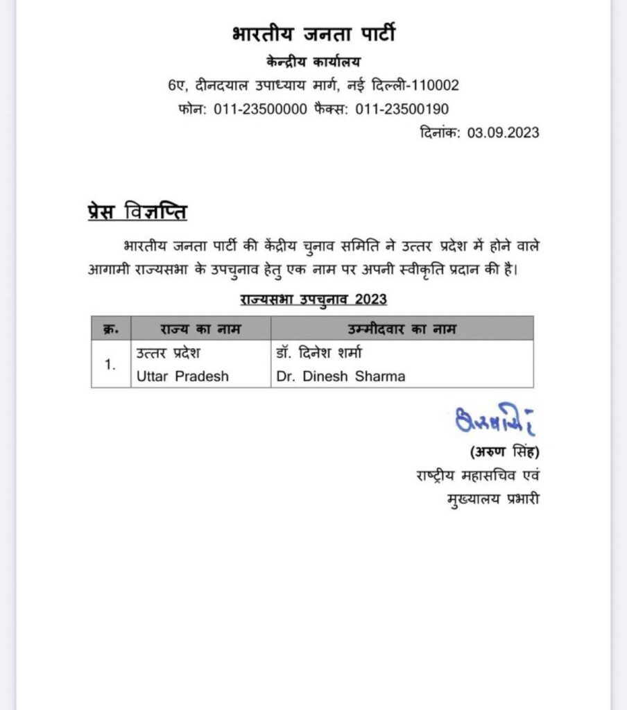 Lucknow news today । उत्तर प्रदेश के पूर्व डिप्टी सीएम डॉ दिनेश शर्मा को राज्यसभा की सीट पर हो रहे उपचुनाव के लिए भारतीय जनता पार्टी ने उम्मीदवार बनाया है। इस सम्बंध में रविवार को भाजपा की केंद्रीय चुनाव समिति ने पत्र जारी कर दिया है।