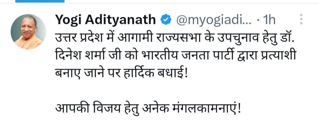 राज्यसभा के लिए होने वाले उपचुनाव में डॉ दिनेश शर्मा के नाम की मुहर लगने के बाद प्रदेश के मुख्यमंत्री योगी आदित्यनाथ ने बधाई दी है। सीएम श्री योगी ने अपने बधाई संदेश में कहा कि उत्तर प्रदेश में आगामी राज्यसभा के उपचुनाव हेतु डॉ दिनेश शर्मा को भारतीय जनता पार्टी द्वारा प्रत्याशी बनाये जाने पर हार्दिक बधाई।