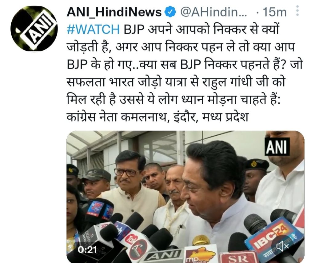 कांग्रेस पार्टी के वरिष्ठ नेता व मध्यप्रदेश के पूर्व मुख्यमंत्री कमलनाथ ने मंगलवार को भारतीय जनता पार्टी पर करारा प्रहार किया है। उन्होंने मीडिया के सवालों का जवाब देते हुए कहा कि बीजेपी अपने आपको निक्कर से क्यों जोड़ती है अगर आप निक्कर पहन लें तो क्या आप बीजेपी के हो गए क्या सब बीजेपी निक्कर पहनते हैं। इंदौर में मीडिया में बोलते हुए उन्होंने कहा कि जो सफलता भारत जोड़ो यात्रा से राहुल गांधी को मिल रही है उससे ये लोग ध्यान मोड़ना चाहते हैं।
