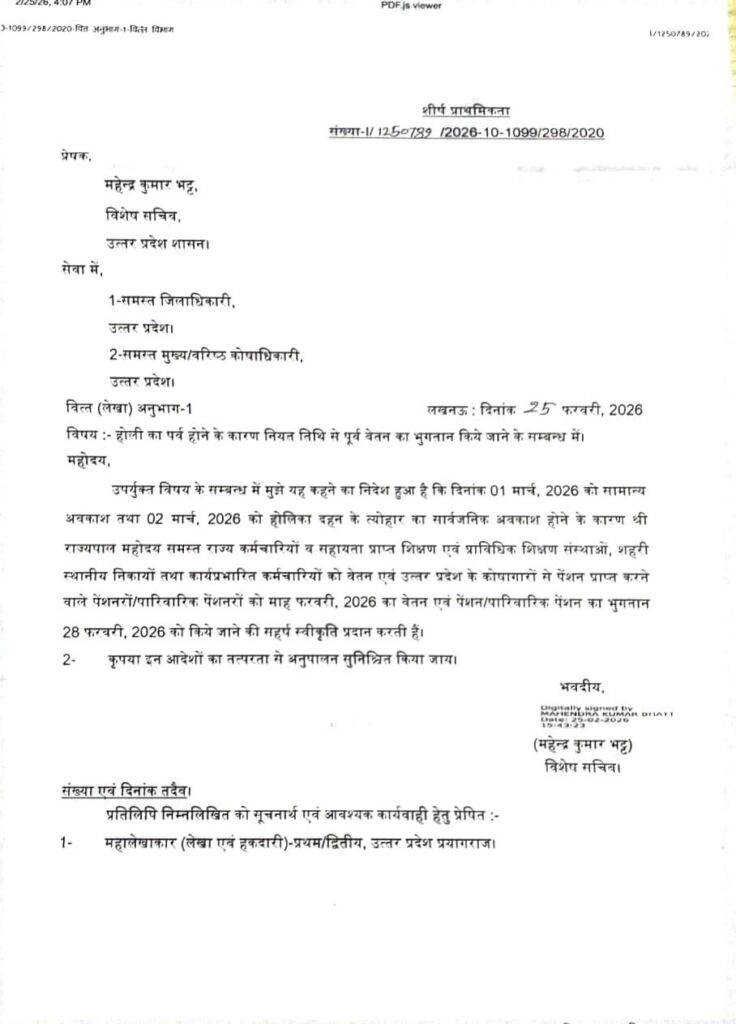 शासन के विशेष सचिव महेश कुमार भट्ट ने सभी जिलाधिकारी समेत अधिकारियों को निर्देश जारी की है कि 2 मार्च को होलिका दहन का अवकाश है और उससे पहले 28 फरवरी को सभी कर्मचारियों का वेतन और पेंशन जारी कर दिया जाए ताकि उनके त्यौहार आराम से बन सके । पढ़िए आदेश