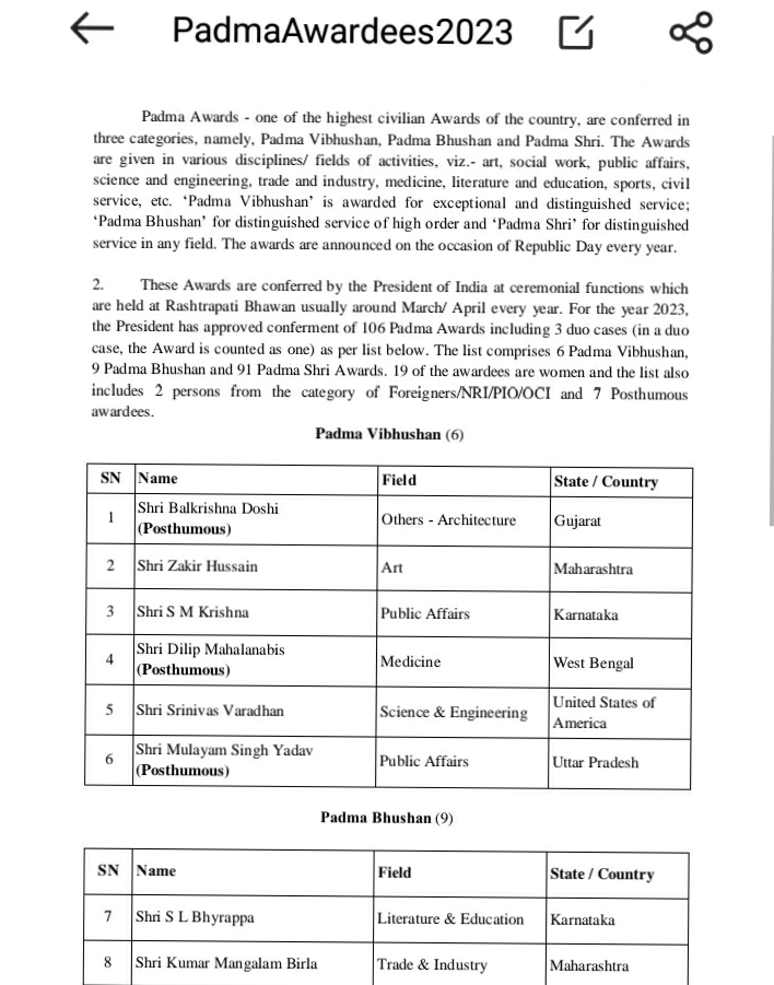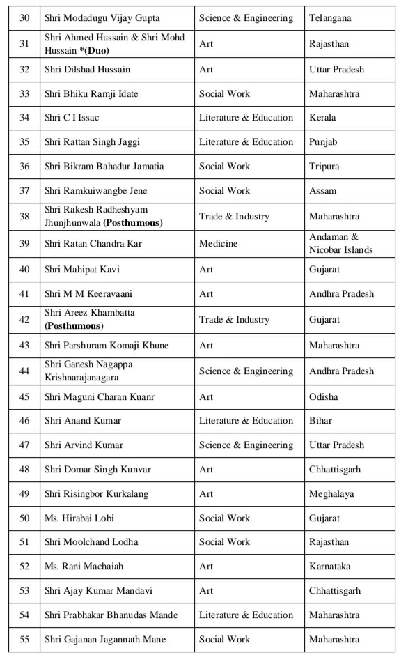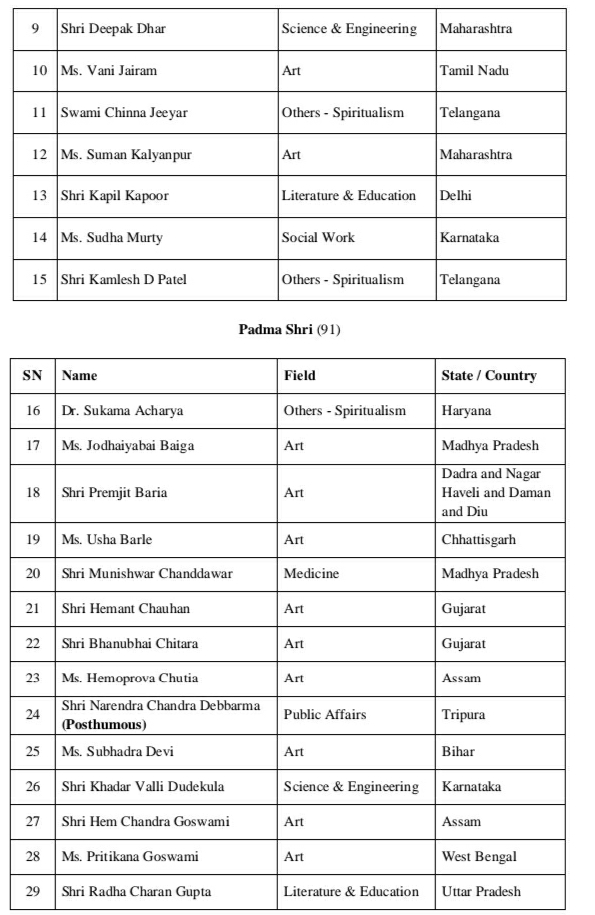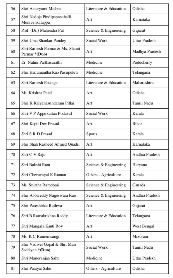 मीडिया रिपोर्ट्स के अनुसार आज 106 लोगों में 19 पुरस्कार विजेता महिलाएं हैं । देखिये पूरी लिस्ट