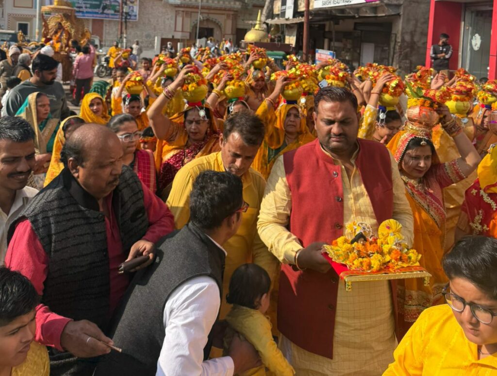 गुरुवार को श्रीमद्भागवत कथा ज्ञान यज्ञ कार्यक्रम के पहले दिन कलश यात्रा का शुभारंभ द्वारकाधीश मंदिर से हुआ। कथा व्यास आचार्य सुखनंदन मयूर की अगुवाई में कलश यात्रा द्वारिकाधीश मंदिर, बड़ी माता मंदिर, छोटी माता मंदिर होते हुए सब्जी मंडी से नाना महाराज मंदिर से झंडा चौराहा होकर कथा स्थल पहुंची। झांकियों व बैंड बाजा पर बज रहे भजनों की ध्वनि पर भक्त जयकारे लगाते व नृत्य करते हुए आगे बढ़ रहे थे। वहीं महिलाएं सिर पर कलश लेकर भक्ति के रस में सराबोर होकर आगे बढ़ रही थी। भव्य शोभायात्रा व कलश यात्रा जिस मार्ग से निकली बैंड-बाजे व डीजे में बज रहे भजनों से माहौल भक्तिमय हो गया। बज रहे भजनों के साथ पारीक्षित कुसुमलता, उदयनारायण तिवारी, कैलाश नारायण, तेज नारायण, सत्यनारायन, जगत नारायण, प्रताप नारायण, राहुल, रोहित, वैभव, हनी, निक्की आदि जयकारे लगाते हुए चल रहे थे।