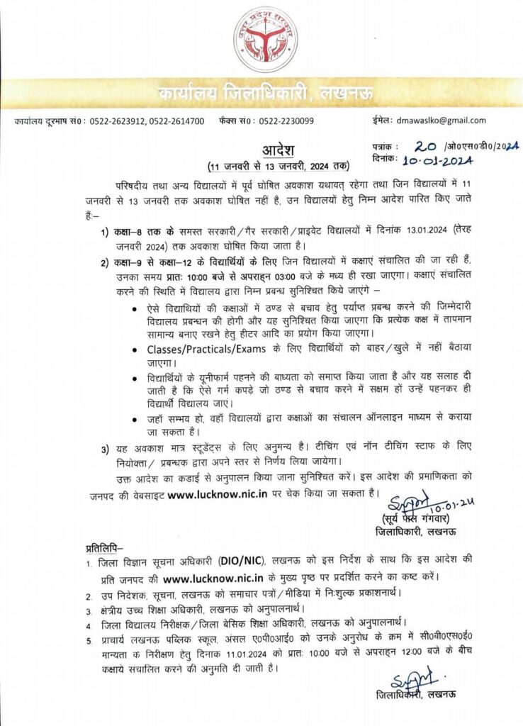 Lucknow news today।शीतलहर का प्रकोप लगातार ही बढ़ता जा रहा है । आलम यह है कि लोग अब दिन में घर से निकलने से पहले पूरी तरह से टोपी और गीलाबज के बिना नहीं निकल रहे हैं। शीत लहर और भीषण सर्दी से बच्चों को बचाने के लिए राजधानी लखनऊ के जिलाधिकारी सूर्यपाल गंगवार ने आज तीन दिन तक स्कूलों की कक्षा 1 से लेकर 8 वी तक कि कक्षाओं की छुट्टियां बढ़ा दी हैं । राजधानी लखनऊ के कक्षा एक से लेकर आठवीं तक की स्कूलों में 13 जनवरी तक छुट्टी कर दी गई है। इसके निर्देश डीएम लखनऊ ने जारी कर दिए हैं। उल्लेखनीय है कि इन दिनों सर्दी कुछ ज्यादा ही पड़ रही है और इसके बाद गलन भरी शीत लहर चल रही है। आलम यह है कि दिन में ही लोग नहीं हाथ सेंकते हुए देखे गए तो कहीं पर पूरी तरह से ढके हुए वह बाहर निकले। शीत लहर के प्रकोप से बच्चों को बचाने के लिए जिलाधिकारी लखनऊ ने 13 जनवरी तक कक्षा 1 से लेकर आठवीं तक के क्लासों को बंद रखने के निर्देश जारी किए हैं । इसके अलावा भी उन्होंने और भी स्कूलों को निर्देश दिए हैं पढ़िए उनके निर्देश