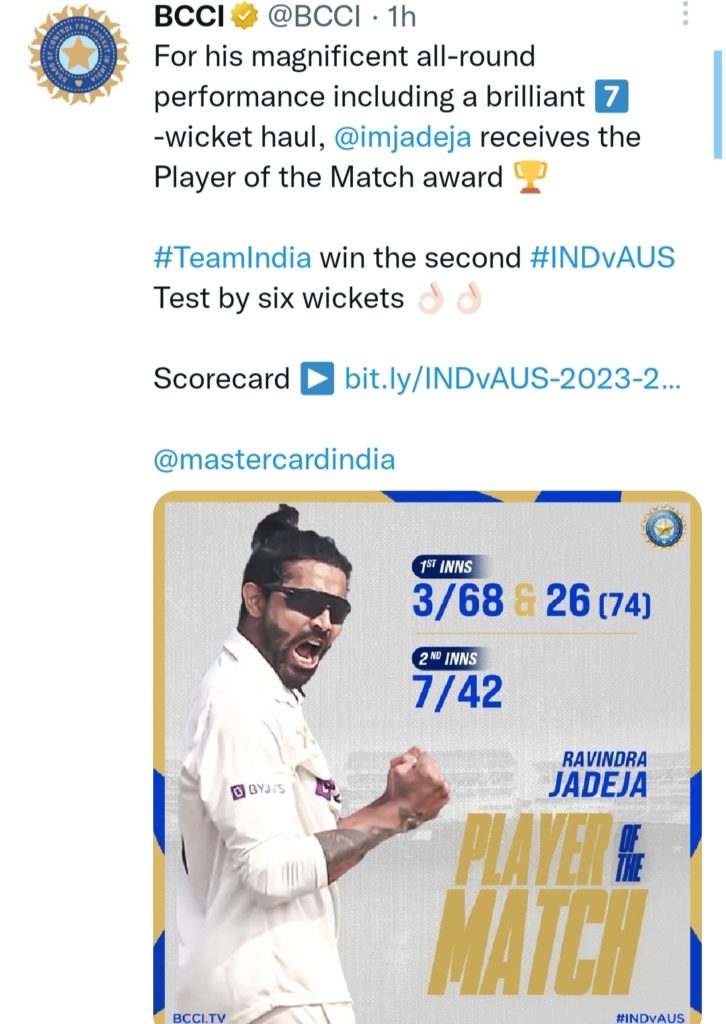 देश की राजधानी दिल्ली में खेले जा रहे दूसरे टेस्ट के तीसरे दिन भारत ने ऑस्ट्रेलिया को छह विकेट से हरा कर जीत हासिल कर ली है । मीडिया रिपोर्ट्स के अनुसार ऑस्ट्रेलिया ने भारत को 115 रन के लक्ष्य दिया था जिसे भारत ने केवल चार विकेट खोकर हासिल कर जीत हासिल कर ली है। मीडिया रिपोर्ट्स के अनुसार भारत की ओर से चेतेश्वर पुजारा ने नाबाद रहते हुए सबसे ज़्यादा 31 रन बनाए। इस मैच में कुल 10 विकेट हासिल करने और पहली पारी में 70 रन बनाने वाले रवींद्र जडेजा को ‘मैन ऑफ द मैच’ घोषित किया गया।