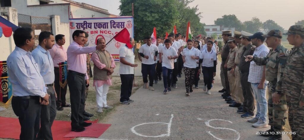 Orai news । लौह पुरूष भारत रत्न सरदार बल्लभ भाई पटेल की जयंती (राष्ट्रीय एकता दिवस) के अवसर पर श्री गांधी इण्टर कालेज उरई प्रांगण से एकता दौड़ रन फाॅर यूनिटी का जिलाधिकारी राजेश कुमार पाण्डेय ने हरी झण्डी दिखाकर रवाना किया। रन फाॅर यूनिटी के आयोजन में एनसीसी कैडेट, छात्र-छात्राओं सहित बड़ी संख्या में लोगो ने भाग लिया। इस दौरान राष्ट्र की एकता, अखण्डता और सुरक्षा तथा देश के आन्तरिक सुरक्षा में योगदान के लिये शपथ ली। रन फाॅर यूनिटी के विजेता छात्र-छात्राओं को पुरस्कृत किया गया। इस अवसर पर अपर जिलाधिकारी नमामि गंगे विशाल यादव, एनसीसी कमाण्डेंड कर्नल दुष्यन्त सिंह, मेजर देवेन्द्र कुलश्रेष्ठ, कैप्टन मनोज राजपूत, जिला विद्यालय निरीक्षक राजकुमार पण्डित, अपर जिला सूचना अधिकारी पंकज तिवारी सहित भारी संख्या में छात्र-छात्रायें एवं गणमान्य मौजूद रहे।
