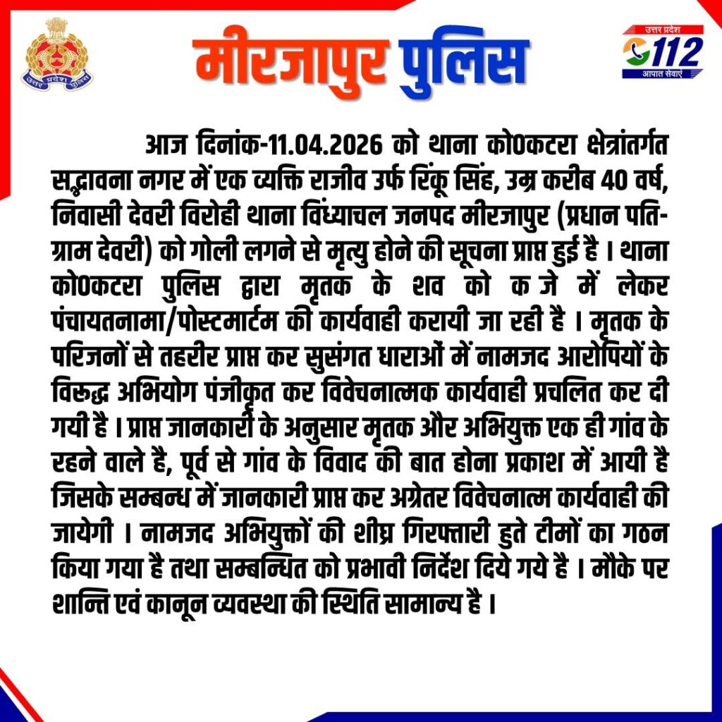 मिर्जापुर के कटरा कोतवाली क्षेत्र में हुई इस सनसनीखेज वारदात की सूचना पाकर मौके पर पहुंची एसपी अपर्णा रजत कौशिक ने मीडिया से जानकारी साझा करते हुए बताया कि आज प्रातः एक सूचना प्राप्त हुई की देवरी गांव की प्रधान के पति को गोली लगी है उनको अस्पताल ले जाते समय उनकी मृत्यु हो गई है। उन्होंने कहा कि सूचना मिलने के तुरंत बाद ही टीम मौके पर पहुंचे और छानबीन शुरू की गई जो व्यक्ति जिसने इस घटना को अंजाम दिया है उसकी पहचान हो गई है वह भी उसी गांव का रहने वाला है और उसकी तलाश के लिए टीमें लगातार जुटी हुई है उन्होंने बताया कि मृतक और आरोपी एक ही गांव के रहने वाले हैं और दोनों में विवाद बताया जा रहा है । फिलहाल टीमें आरोपी की तलाश के लिए जुटी हुई है।