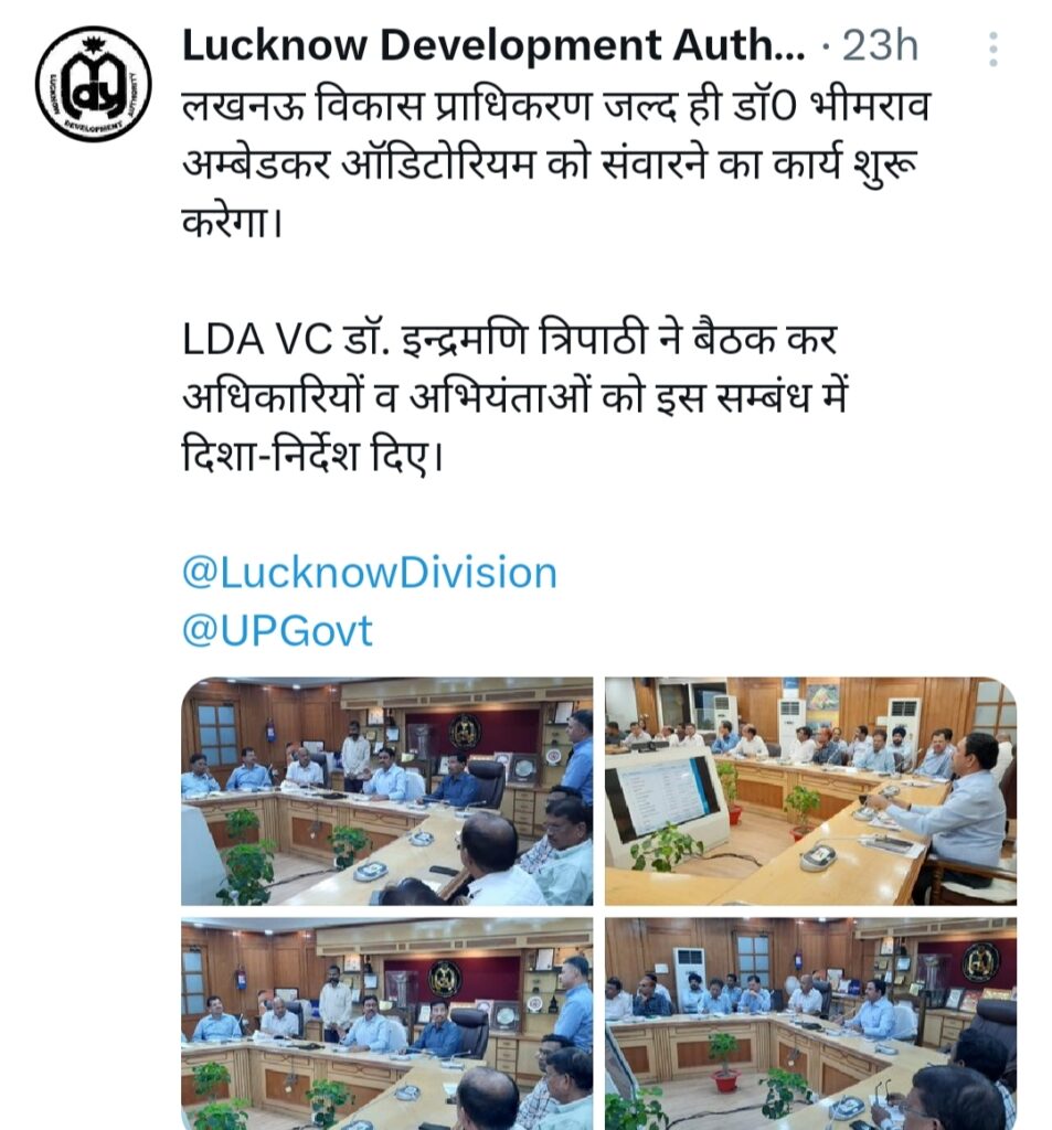 Lucknow news today । एलडीए जल्द ही डॉ0 भीमराव अम्बेडकर ऑडिटोरियम को संवारने का कार्य शुरू करेगा। प्राधिकरण के उपाध्यक्ष डॉ0 इन्द्रमणि त्रिपाठी ने सोमवार को अधिकारियों व अभियंताओं के साथ बैठक करके इस सम्बंध में दिशा-निर्देश दिये। उन्होंने कहा कि ऑडिटोरियम में सफाई, रंगाई-पुताई, स्टेज, पैनलिंग, फ्लोरिंग, ब्रिक वर्क, लाइटिंग व साउंड सिस्टम समेत मरम्मत आदि के जो भी कार्य होने हैं, उनके आगणन का पुन: परीक्षण करा लिया जाए। इसमें जो कार्य अति महत्वपूर्ण हैं, उन्हें प्रथम फेज में पूर्ण कराते हुए ऑडिटोरियम का संचालन शुरू करा दिया जाए, जिससे कि लोग इस ऑडिटोरियम का लाभ उठा सकें।