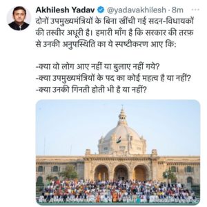 विधानसभा के बाहर हुए फोटो सेशन को लेकर यूपी के नेता प्रतिपक्ष अखिलेश यादव ने सवाल उठाते हुए सरकार से जवाब मांगा है। उन्होंने रविवार को ट्वीट करते हुए कहा कि दोनों उप मुख्यमंत्रियों के बिना खींची गई सदन विधायकों की तस्वीर अधूरी है हमारी मांग है कि सरकार की तरफ से उनकी अनुपस्थिति का यह स्पष्टीकरण आए कि