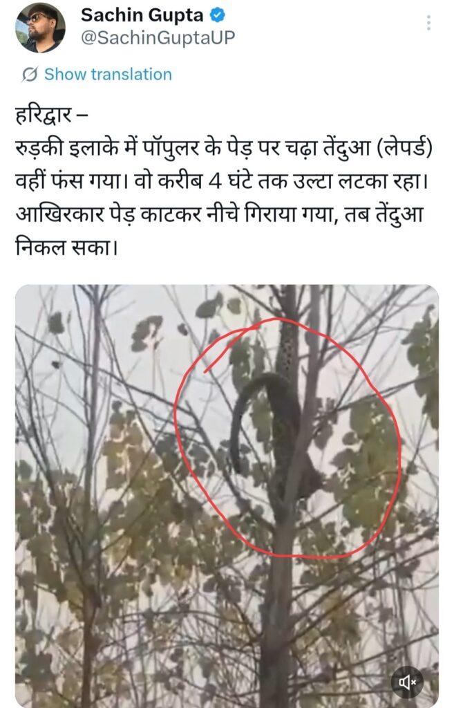 वायरल वीडियो में स्पष्ट देखा जा सकता है कि एक तेंदुआ पॉपुलर के पतले पेड़ पर उल्टा लटका हुआ है और वह छटपटाहट से नीचे उतरने का प्रयास तो कर रहा पर पेड़ बहुत ऊंचा होने की वजह से वह नीचे नहीं उतर पा रहा है। मीडिया रिपोर्ट्स के अनुसार तेंदुए के पेड़ पर उल्टा लटके होने पर स्थानीय लोगों ने उसे बचाने के लिए पेड़ को नीचे से काट दिया जब पेड़ गिरा तब तेंदुआ भी नीचे गिरा और वह वहाँ से भाग गया। फिलहाल इसका वीडियो भी वायरल हो रहा है।