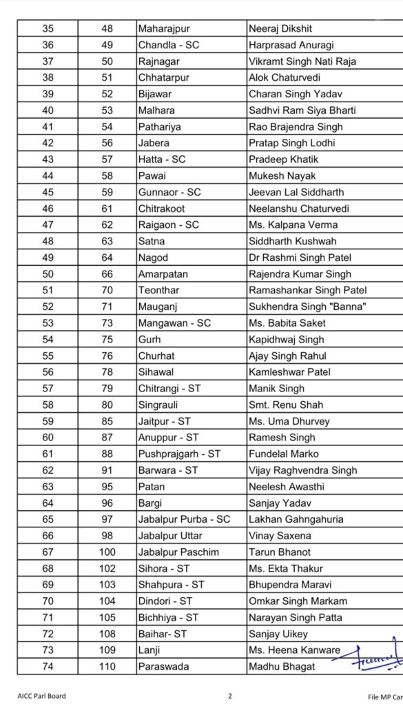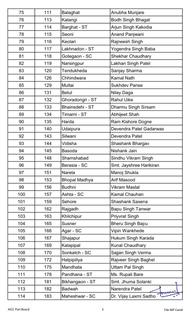 MP news today : मध्य प्रदेश में होने वाले विधानसभा चुनाव को लेकर नवरात्रि के पहले दिन कांग्रेस पार्टी ने अपने 144 उम्मीदवारों की लिस्ट जारी कर दी है । मीडिया रिपोर्ट्स के अनुसार आज जारी हुई इस लिस्ट में लहार विधानसभा क्षेत्र से पूर्व मंत्री गोविंद सिंह को प्रत्याशी बनाया गया है तो वही ग्वालियर ग्रामीण से साहिब सिंह गुर्जर ग्वालियर पूर्व से सतीश सिकरवार व ग्वालियर दक्षिण से प्रवीण पाठक को मैदान में उतारा गया है। देखिए पूरी 144 उम्मीदवारों की पूरी लिस्ट