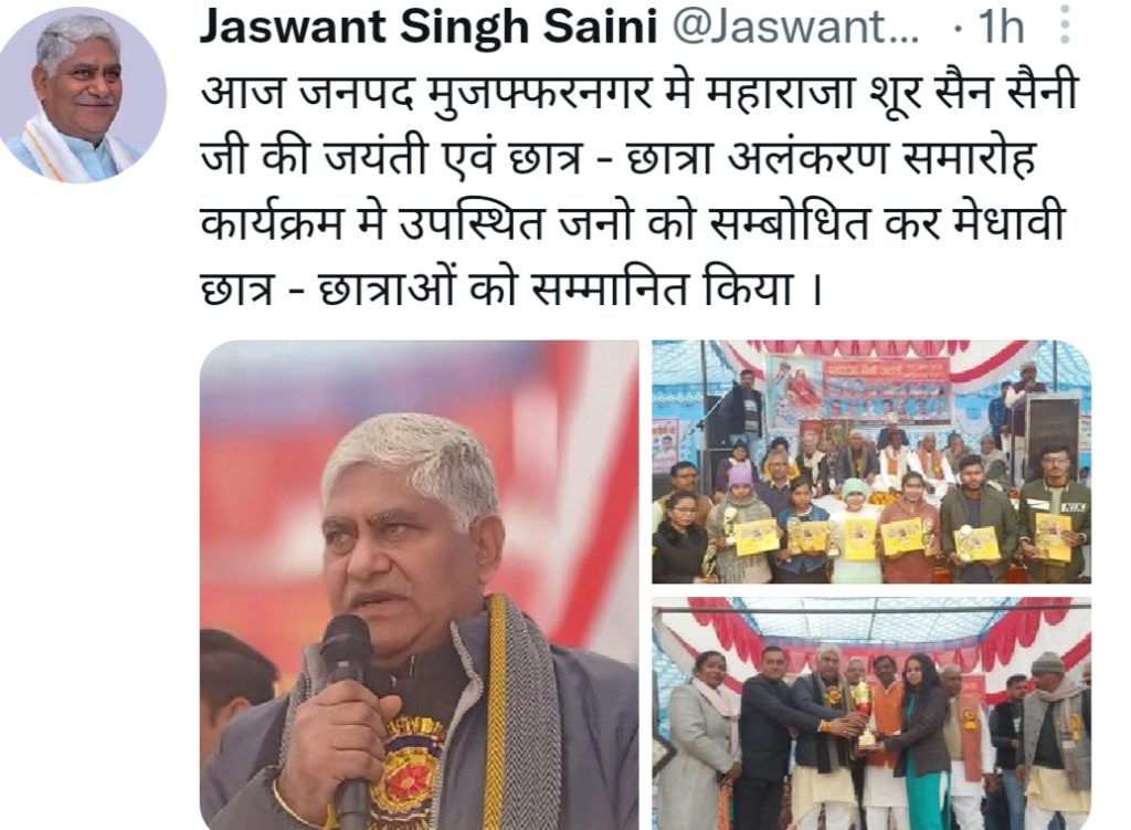 मुजफ्फरनगर में हुए इस कार्यक्रम के सम्बंध में संसदीय कार्य एवं औद्योगिक विकास मंत्री ने ट्वीट करते हुए कहा कि आज जनपद मुजफ्फरनगर में महाराजा शूरसेन सैनी जी की जयंती एवं छात्र छात्राओं के अलंकरण समारोह कार्यक्रम में उपस्थित जनों को सम्बोधित कर मेधावी छात्र छात्राओं को सम्मानित किया।