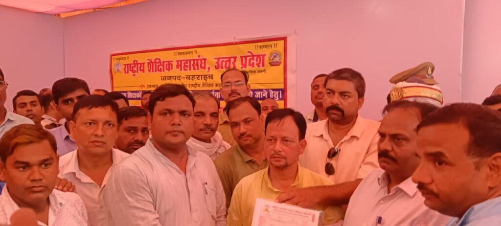 Bahraich news today : अखिल भारतीय राष्ट्रीय शैक्षिक महासंघ के द्वारा लिए गए निर्णय के अनुसार 15 सितम्बर (सोमवार) कों पूरे भारतवर्ष में एक साथ सभी जिलों के जिला मुख्यालय में शिक्षकों पर जबरन टी.ई.टी.थोपने के विरोध में राष्ट्रीय शैक्षिक महासंघ, बहराइच के जिलाध्यक्ष आनन्द मोहन मिश्र के मार्गदर्शन में जिला कलेक्ट्रेट बहराइच धरना स्थल पर भारी संख्या में शिक्षक, शिक्षिकाओं ने एकत्रित होकर प्रधानमंत्री सम्बोधित अखिल भारतीय राष्ट्रीय शैक्षिक महासंघ का ज्ञापन जिलाधिकारी बहराइच के माध्यम से उनके प्रतिनिधि सिटी मजिस्ट्रेट राजेश चौरसिया कों सौंपकर टी.ई.टी. अहर्ता लागू होने से पूर्व नियुक्त सभी शिक्षकों टी.ई.टी. अहर्ता अनिवार्यता सम्बंधी आर.टी.ई. एक्ट में संशोधन किए जाने हेतु ज्ञापन देकर आग्रह किया गया।