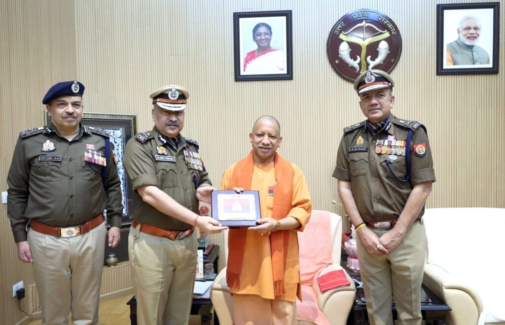 Lucknow news today । उत्तर प्रदेश के डीजीपी राजीव कृष्ण ने आज मुख्यमंत्री योगी आदित्यनाथ को पुलिस झंडा दिवस के अवसर पर पुलिस झंडा लगाया। इस अवसर पर अपर पुलिस महानिदेशक अमिताभ यश और एडीजी आर के भगत भी मौजूद रहे।